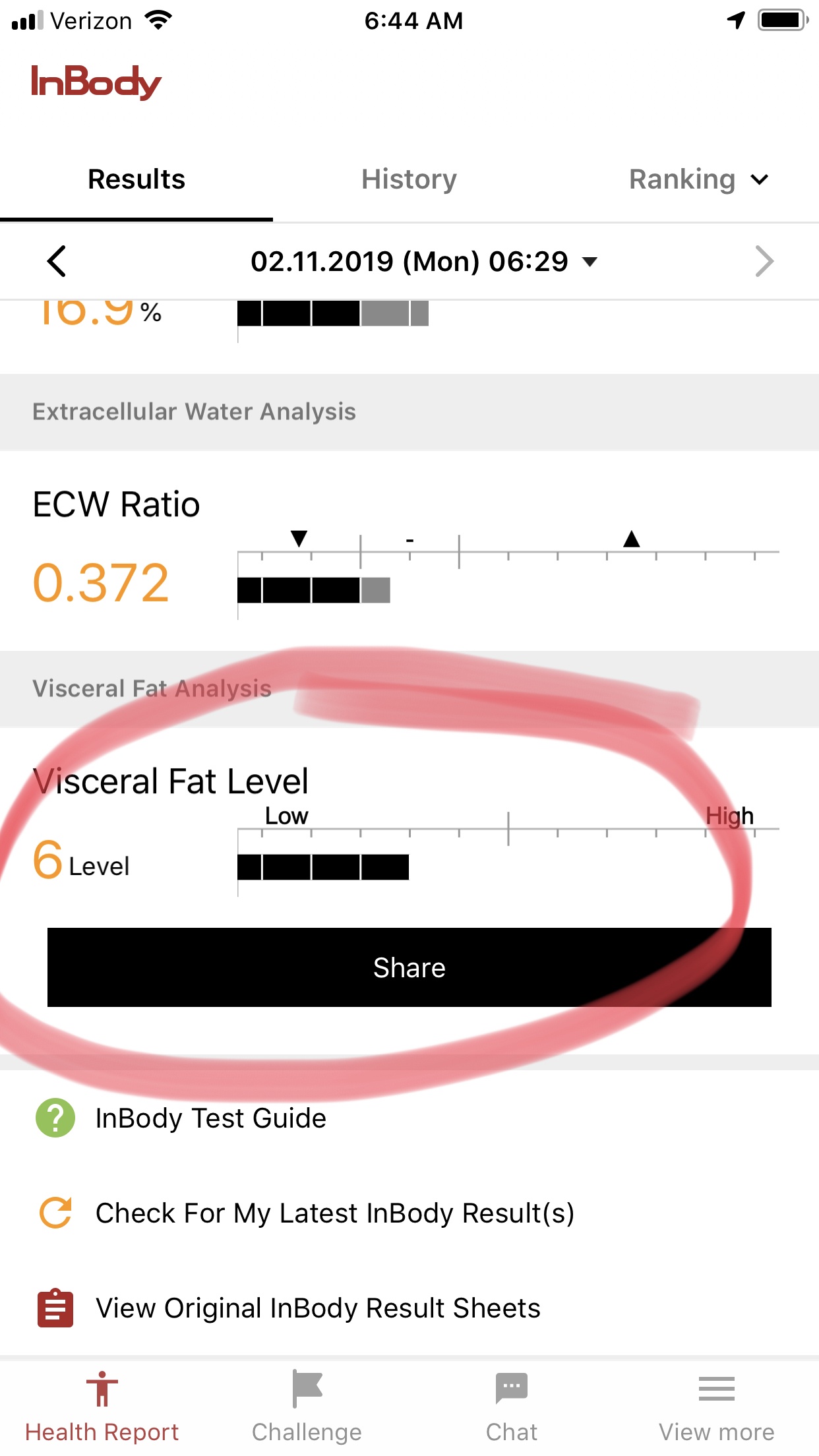 This is where we find out how much fat we are packing in and around our organs. We want that number to be as low as possible. 10 and under is considered "healthy" (my doc is looking for 5 and under). Anything over 10 and you are on a dangerous path.